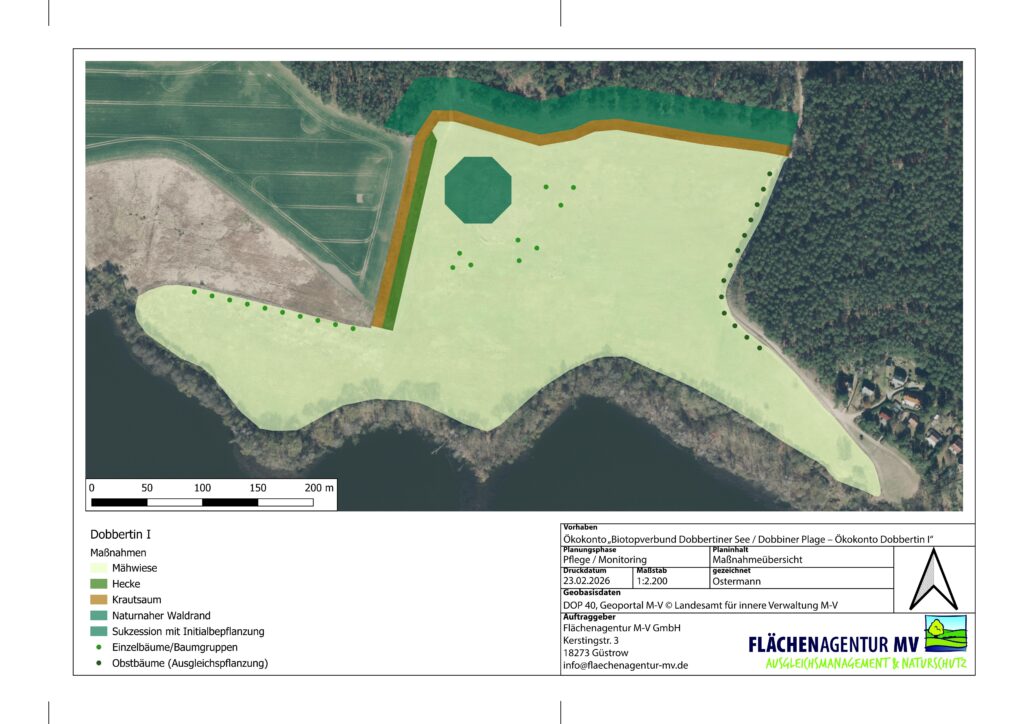 Das Ökokonto „Biotopverbund Dobbertiner See / Dobbiner Plage – Ökokonto Dobbertin I“ liegt idyllisch am nordwestlichen Ufer des Dobbertiner Sees nahe der Ortschaft Dobbertin im Landkreis Ludwigslust-Parchim. Die bis 2021 als Intensivacker genutzte Fläche ist rund 11,4 ha groß. Durch ein Potpourri verschiedener Maßnahmetypen wie einer extensiven Mähwiese, Feldhecken, einer Initialbepflanzung am Waldrand sowie vorgelagerten Krautsäumen bietet das Ökokonto eine große Strukturvielfalt und somit potentielle Lebensräume für verschiedenste Tier- und Pflanzenarten. Anfang 2025 kam eine weitere Baumreihe aus 13 Obstbäumen alter Sorten (Apfel, Birne, Kirsche, Pflaume) hinzu, die als Ausgleichspflanzung für eine Infrastrukturmaßnahme nachträglich in das Ökokonto integriert werden konnte.