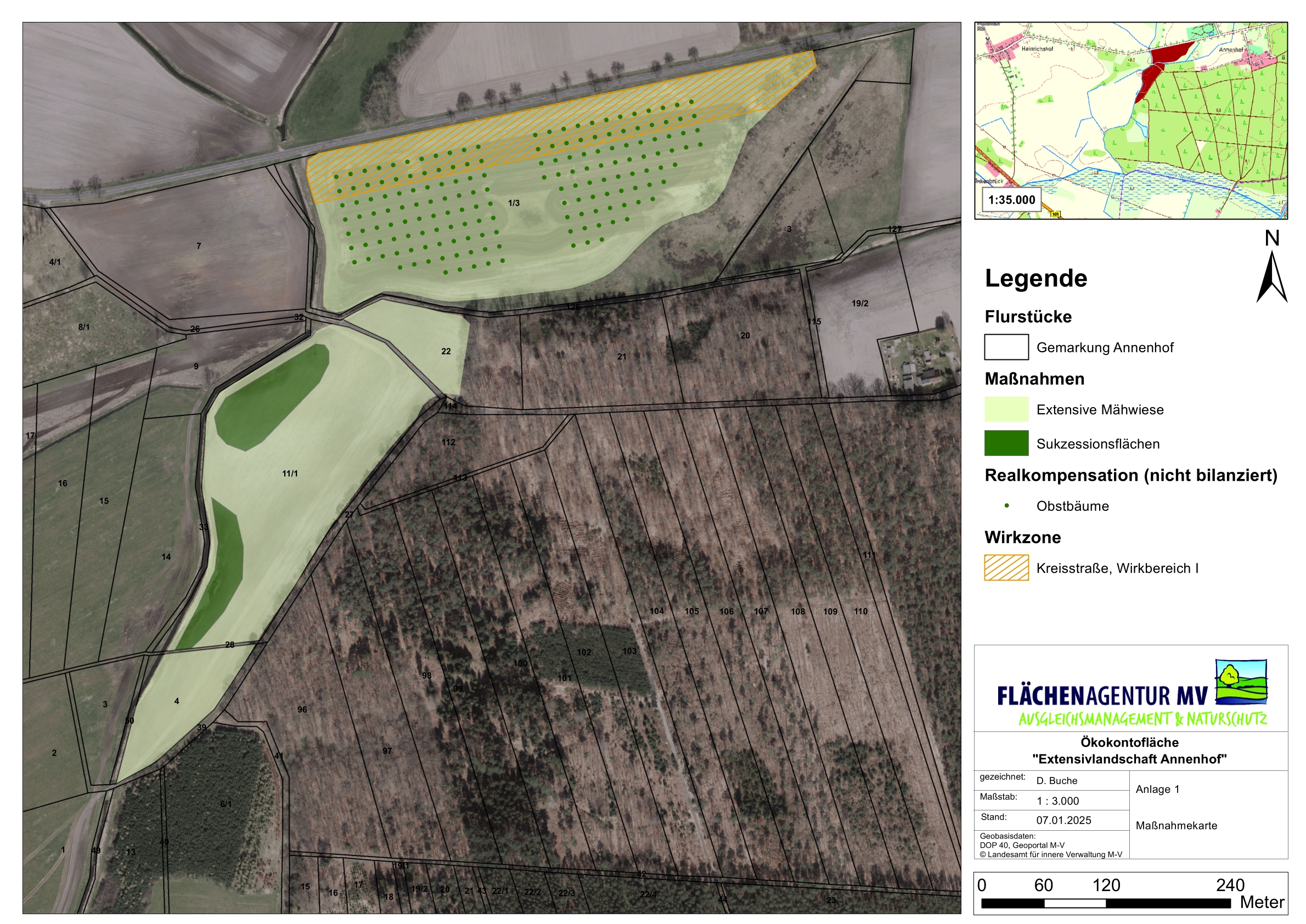 Das Ökokonto „Extensivlandschaft Annenhof“ befindet sich etwa 10km westlich der Stadt Ueckermünde und rund 800m westlich der Ortschaft Annenhof. Die 12,1 ha große Maßnahmefläche befindet sich vollständig im Naturpark „Am Stettiner Haff“ und gehörte bislang zu intensiv landwirtschaftlich genutzten Ackerflächen. Diese wird nun durch Aushagerung, Selstbegrünung und Ansalbung von Zielarten sukzessive eine in eine extensive Mähwiese umgewandelt. Zusätzlich entstehen mehrere Waldsukzessionsflächen, bei denen auf 50% der Fläche eine Initialbepflanzung mit Pioniergehölzen wie Stileiche, Winterlinde, Salweide und Hainbuche sowie Wildobst und Straucharten erfolgte, sowie die Pflanzung von 170 Obstbäumen. Um den Wert der Maßnahmen für den Artenreichtum sichtbar zu machen, wird die Fläche des Ökokontos auch nach der Umsetzung weiter im Monitoring betreut.