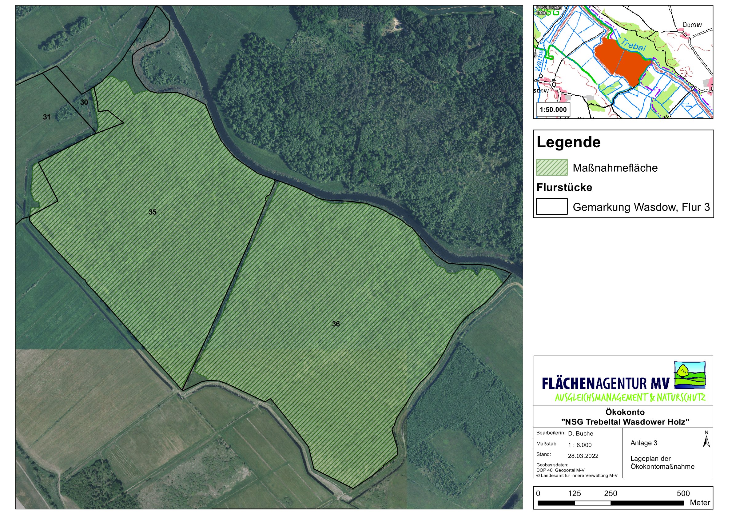 Das Ökokonto „NSG Trebeltal Wasdower Holz“ liegt direkt an der Trebel zwischen Wasdow und Dorow und ist Teil der Naturschutzgebietes Trebeltal. Die Landschaft wird durch den spätglazial entstandenen breiten Talraum der Trebel geprägt. Die Maßnahmefläche umfasst 108,16 ha und somit den überwiegenden Teil des sogenannten „Wasdower Holzes“.