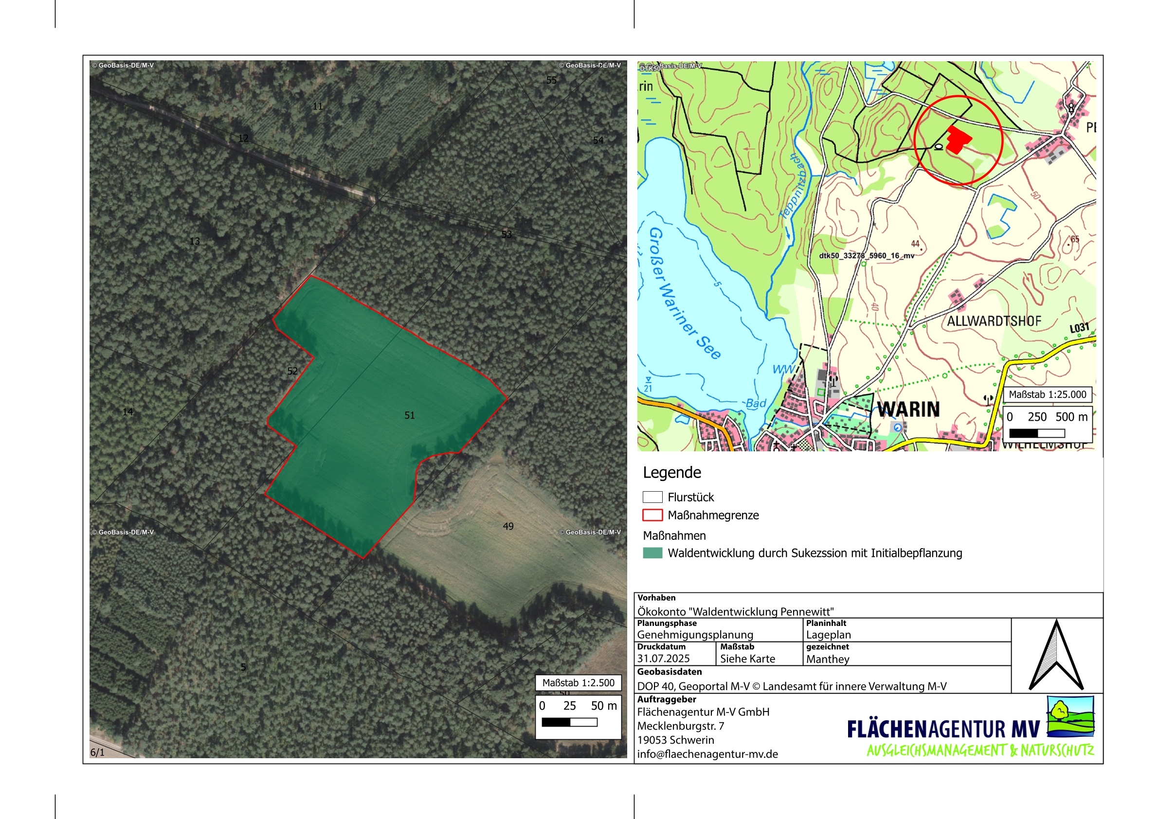 Das Ökokonto „Waldentwicklung Pennewitt“ befindet sich im Osten des Landkreises Nordwestmecklenburg, etwa drei Kilometer nördlich der Gemeinde Warin. Die 3,05 ha große Fläche ist von einem Kiefernwald mit Laubholzunterbau umschlossen und hat im Süden auf einer Breite von ca. 50 m Anschluss an eine Ackerfläche. Die Fläche selbst wurde zuvor ebenfalls als Acker konventionell bewirtschaftet. Der sandige Boden ist sehr trocken und nährstoffarm. Ziel der Maßnahme ist es, aus dem ehemaligen Ackerland eine naturnahe Waldsukzessionsfläche entstehen zu lassen.
