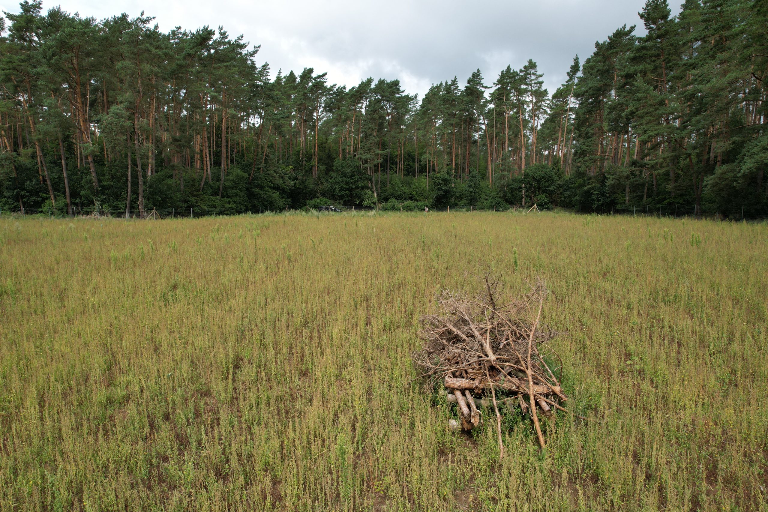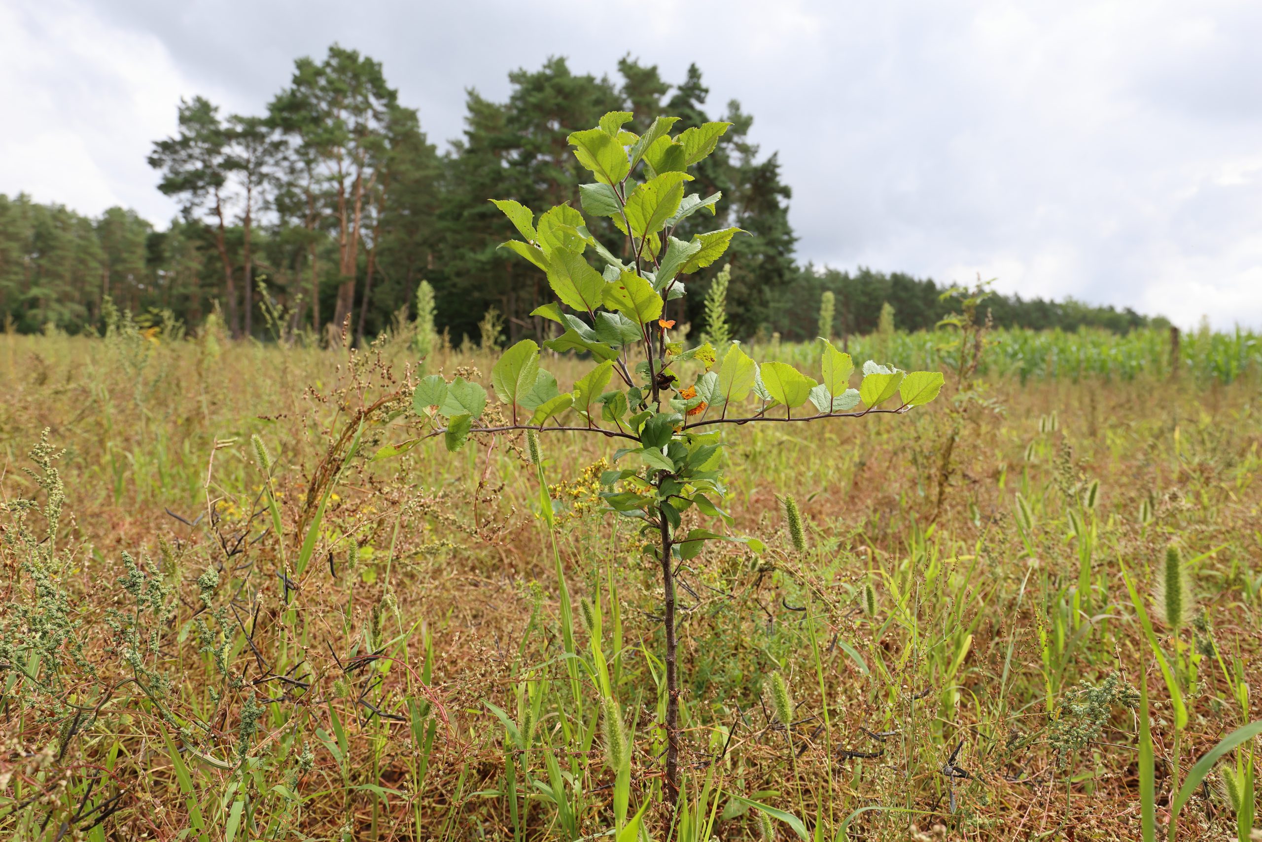 Im Winter 2024/25 wurde auf etwa einem Drittel der Fläche eine Initialbepflanzung mit gebietsheimischen Waldgehölzen vorgenommen. Die Auswahl der Arten erfolgte standortgerecht auf Grundlage der Bodenverhältnisse. Gepflanzt wurden unter anderem Stieleichen, Winterlinden sowie verschiedene Wildobstarten, die zusammen eine artenreiche und strukturreiche Vegetation fördern sollen. Die Gehölze wurden in kreisförmigen Pflanzentrupps – kleinflächigen, artgemischten Gruppen – über die Fläche verteilt. Diese Bepflanzungsweise schafft vielfältige Lebensräume und unterstützt die ökologische Aufwertung der Fläche nachhaltig. Naturverjüngung aus anfliegenden Kiefern ist ausdrücklich erwünscht. Langfristig wird auf der Fläche ein natürlicher Mischwald entstehen. Die Waldfläche unterliegt einem dauerhaften Nutzungsverzicht, sodass hier ein echter Naturwald entstehen kann.